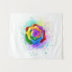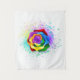 Large, blooming rose with rainbow petals on white background, painted over with splashes of colorful, bright paint. 3d