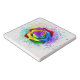 Large, blooming rose with rainbow petals on white background, painted over with splashes of colorful, bright paint. 3d