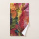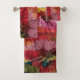 This beautiful bath towel set features an image of a contemporary abstract fabric pattern in wavy psychedelic rainbow colors of pink, red, yellow, orange, green, blue, brown, mauve, purple and turquoise which resembles a painter's palette.