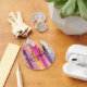 A key chain with an abstract background design. Vibrant stripes in both bold and pastel colors. Pinks, blues, purples and yellow colors combined with faux gold sparkly glitter layered over top.