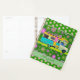 A colorful classic coach camper, sporting vibrant turquoise blue, lime green, tangerine orange, and pink, sits against a cheerful mod flower background. The retro floral background is avocado green, lime green, bright pink, violet, and lilac. There is a template on the front where you can add a name or other text. The cute retro floral pattern is also on the back of the planner. This could be a fun travel log, especially for someone who loves road trips or camping.