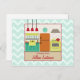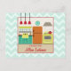 A recipe postcard featuring an illustration of a retro inspired kitchen decorated with a red, turquoise, yellow, and orange color scheme. Personalize the text with your name. Background is light blue with zig zags. Opposite side is blank.