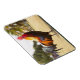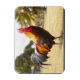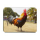 Photograph of a handsome colorful rooster standing on grass with trees in background.