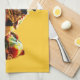 This kitchen towel features a colorful artistic rooster on a gold background.