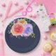 Paper plates with a fanciful floral bouquet with watercolor roses. Stylish, whimsical and creative. A bundle of roses in pink, purple and yellow. With lots of sprigs and leaves in green, pink, purple and blue. Background is navy blue.