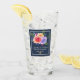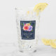 Wedding commemorative drinking glass with a fanciful floral bouquet with watercolor roses. Stylish, whimsical and creative. A bundle of roses in pink, purple and yellow. With lots of sprigs and leaves in green, pink, purple and blue. Background is a navy blue color. 2 golden wedding rings placed below the text.