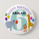 This colorful and bright birthday wrapping paper features rainbow text that reads "happy birthday!" followed by a personalized name and large blue number for the birthday kid's new age. Party ready African animals, an elephant, giraffe and lion are all ready to celebrate with cake, balloons and party hats.