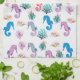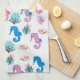 Colorful seahorses mingle with coral, seaweed, and seashells on this ultra cute marine life kitchen towel.