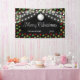 Elegant Christmas banner features string lights and Christmas ball on a colorful snowflakes black background with vibrant typography "Merry Christmas". Personalize it with your name.