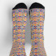 Colorful socks with vibrant geometric patterns in blue, yellow, red, and black. The top image shows the socks from above, and the bottom image shows a side view. The design conveys a playful and lively tone.