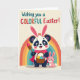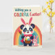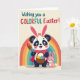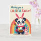 Designed with a cheerful spring scene, the card features a large black-and-white bear-like animal with dark eye patches wearing tall bunny ears lined in pink 🐰. A soft pink scarf and a flowing pink cape drape around its shoulders, and its gentle posture suggests a friendly, caring nature. In its paws, it carries a woven basket filled with decorated eggs in bright blue, yellow, and purple, along with a paintbrush tipped in pink, as if it has been painting for someone special. Right beside it sits a smaller, all-pink bunny companion, looking up with wide eyes and a sweet smile that feels like a quiet moment between close friends 🐇. A wide rainbow arcs behind them in bands of red, orange, yellow, green, and blue, set against a creamy background that keeps the characters front and center. Near the top, the greeting reads “Wishing you a COLORFUL Easter!” with “COLORFUL” in multicolored letters while the rest of the text appears in a darker shade for contrast. The basket weave and the egg patterns are clearly detailed, and the rainbow curves smoothly above the pair.