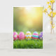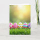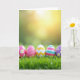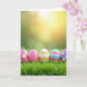 The front design shows five egg-shaped decorations lined up on freshly cut green grass, photographed from a low angle so the blades in front look crisp while the background fades into a soft blur. The first egg is rich pink with small white daisies, and beside it sits another rosy egg covered in tidy white polka dots, like two friends leaning close in a shared moment. Next comes a white egg with yellow zigzag stripes, followed by an egg with gentle horizontal bands of aqua, pink, and white, creating a sweet, companionable rhythm across the row 🐰. The last egg is deep purple with white daisies, rounding out the lineup with a calm, affectionate balance 🐇. A short greeting sits near the top center in light yellow lettering, with a smaller line of text tucked just beneath it in soft white. Above the eggs, warm golden light fills the upper half of the scene, and the letters float against those glowing circles. The background is dotted with sunlit bokeh in pale gold, fading upward like a soft haze.