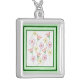 A colorful drawing of three types of flowers, in red, lavender, and orange, as a collage, printed in pendant necklaces. The flowers include tulips, and ones with heart shaped petals. The array of flowers is positioned inside a two toned green frame.