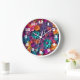A clock with a cool digital 3d style pattern. Bright and colorful flowers with a cool style which looks like paper cutouts.