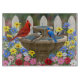 A spring gathering of colorful birds and flowers around a pretty water fountain birdbath.