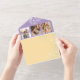 A vintage-inspired, romantic wedding invitation featuring soft pastel colors like yellow, lavender, sage green, and peach coral. The design should be elegantly framed with delicate wildflowers, creating a timeless, chic look. The invitation should have a space for up to three photos of the couple, seamlessly integrated into the design. Include a small, elegant QR code on the side for RSVPs, and a hint of texture or a wax seal-like element for a personal touch. The overall feel should be sophisticated, airy, and warm, capturing the essence of love and celebration in a vintage style.