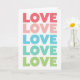 This very cute greeting card is simple and sweet, with the word “LOVE” stacked five times in a neat vertical line. Each “LOVE” is in a plain sans-serif style, with even spacing and a slight shadow that makes the letters stand out. The top “LOVE” is coral, followed by a soft pink, then a light sky blue in the middle. Below that, the next “LOVE” is teal, and the bottom one is lime green, so the colors shift from warm to cool as your eyes move down. The background is solid white, which helps the colorful text feel like the main focus. There are no characters or extra objects—just a clear message that fits romance, affection, or friendship ❤️💌🍫. Share it with someone special and pass along a little extra love