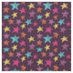 Bright and bold painted style illustrations of stars in lilac purple, bright turquoise blue, yellow, magenta pink and orange are set against a dark purple background on this patterned fabric.