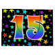 This exciting, fun, and vibrant gift bag design features a pattern of colorful star shapes, along with the number "15" having a multicolored rainbow inspired spectrum gradient pattern, on a black colored background. A gift bag like this might be a fun way to wrap presents or gifts being given for somebody’s fifteenth birthday, or perhaps for a couple’s fifteenth wedding anniversary, or some other 15th event. [~Z0000347]