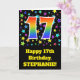The front of this exciting, fun, and vibrant birthday greeting card design features a colorful star shapes pattern, along with the number "17" featuring a multicolored rainbow spectrum like gradient pattern, on a black colored background. The front also features a birthday greeting message, including a personalized recipient name. The inside features a customized birthday greeting message, or could perhaps be cleared and left blank if a message is to be written by hand instead. A customizable birthday card like this might be a fun way to acknowledge somebody’s seventeenth birthday. [~Z0000348]