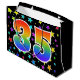 This exciting, fun, and vibrant gift bag design features a colorful star field inspired pattern, along with the number "35" having a multicolored rainbow spectrum like gradient pattern, on a black colored background. A gift bag like this might be a fun way to wrap presents or gifts being given for somebody’s thirty fifth birthday, or perhaps for a couple’s thirty fifth wedding anniversary, or some other 35th event. [~Z0000347]