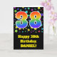 The front of this exciting, fun, and vibrant birthday greeting card design features a colorful star shapes pattern, along with the number "38" featuring a multicolored rainbow spectrum like gradient pattern, on a black colored background. The front also features a birthday greeting message, including a customized recipient name. The inside features a custom birthday greeting message, or could perhaps be cleared and left blank if a message is to be written by hand instead. A customizable birthday card like this might be a fun way to send a message in celebration of somebody’s thirty eighth birthday. [~Z0000348]