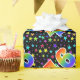 This exciting, fun, and vibrant wrapping paper design features a colorful star field pattern, along with the number "46" having a multicolored rainbow spectrum like gradient pattern, on a black colored background. Wrapping paper like this could perhaps be a fun way to wrap presents or gifts being given for somebody’s forty sixth birthday, or perhaps for a couple’s forty sixth wedding anniversary, or some other 46th event. [~Z0000345]