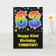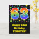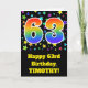 The front of this exciting, fun, and vibrant birthday greeting card design features a colorful star field inspired pattern, along with the number "63" having a multicolored rainbow spectrum like gradient pattern, on a black colored background. The front also features a birthday greeting message, including a customizable recipient name. The inside features a personalized birthday greeting message, or could perhaps be cleared and left blank if a message is to be written by hand instead. A custom birthday card like this might be a fun way to send birthday wishes to somebody who is celebrating their sixty third birthday. [~Z0000348]