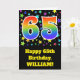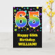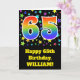The front of this exciting, fun, and vibrant birthday greeting card design features a colorful star field inspired pattern, along with the number "65" having a multicolored rainbow spectrum like gradient pattern, on a black colored background. The front also features a birthday greeting message, including a personalized recipient name. The inside features a custom birthday greeting message, or could perhaps be cleared and left blank if a message is to be written by hand instead. A personalized birthday card like this might be a fun way to send a message in celebration of somebody’s sixty-fifth birthday. [~Z0000348]