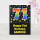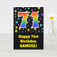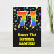 The front of this exciting, fun, and vibrant birthday greeting card design features a pattern of colorful star shapes, along with the number "71" having a multicolored rainbow inspired spectrum gradient pattern, on a black colored background. The front also features a birthday greeting message, including a custom recipient name. The inside features a personalized birthday greeting message, or could perhaps be cleared and left blank if a message is to be written by hand instead. A custom birthday card like this might be a fun way to send birthday wishes to somebody who is celebrating their seventy first birthday. [~Z0000348]