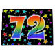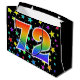 This exciting, fun, and vibrant gift bag design features a colorful pattern of star shapes, along with the number "72" featuring a multicolored rainbow spectrum like gradient pattern, on a black colored background. A gift bag like this might be a fun way to wrap presents or gifts being given for somebody’s seventy second birthday, or perhaps for a couple’s seventy second wedding anniversary, or some other 72nd event. [~Z0000347]