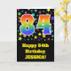 The front of this exciting, fun, and vibrant birthday greeting card design features numerous colorful star shapes, along with the number "84" featuring a multicolored rainbow inspired spectrum gradient pattern, on a black colored background. The front also features a birthday greeting message, including a custom recipient name. The inside features a customizable birthday greeting message, or could perhaps be cleared and left blank if a message is to be written by hand instead. A personalized birthday card like this might be a fun way to acknowledge somebody’s eighty fourth birthday. [~Z0000348]