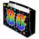 This exciting, fun, and vibrant gift bag design features a colorful pattern of star shapes, along with the number "86" featuring a multicolored rainbow spectrum like gradient pattern, on a black colored background. A gift bag like this might be a fun way to wrap presents or gifts being given for somebody’s eighty sixth birthday, or perhaps for a couple’s eighty sixth wedding anniversary, or some other 86th event. [~Z0000347]