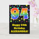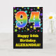 The front of this exciting, fun, and vibrant birthday greeting card design features a colorful star field pattern, along with the number "94" having a multicolored rainbow spectrum like gradient pattern, on a black colored background. The front also features a birthday greeting message, including a personalized recipient name. The inside features a personalized birthday greeting message, or could perhaps be cleared and left blank if a message is to be written by hand instead. A personalized birthday card like this might be a fun way to acknowledge somebody’s ninety fourth birthday. [~Z0000348]