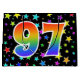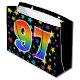 This exciting, fun, and vibrant gift bag design features a colorful star shapes pattern, along with the number "97" featuring a multicolored rainbow spectrum like gradient pattern, on a black colored background. A gift bag like this could perhaps be a fun way to wrap presents or gifts being given for somebody’s ninety seventh birthday, or perhaps for a couple’s ninety seventh wedding anniversary, or some other 97th event. [~Z0000347]