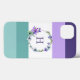 Colorful iPhone case done in bold color block pattern of purples and aquas, with a pretty wreath in the middle with a single purple letter monogram. Personalize the one letter monogram, for yourself or as a great gift idea.