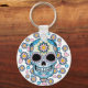 Sugar skull designed hues of blue and pink is surrounded by colorful flowers and hearts.