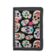 Bright images of sugar skulls make a colorful pattern on this unique wallet. There are ten different skull images, all individual in various colors, and placed on a dramatic black background.