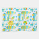 Colorful and joyful summer and beach objects pattern featuring illustration of ice-cream truck, beach ball, sand bucket, surf, ice-cream, water drops and a creative sun badge with a name monogram.
