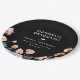 Modern chic, colorful summer floral and greenery, graduation party paper plate. Features, black background color, graduation cap accent, template text lines for graduate's name, school/degree and graduation year.