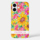 Customize this colorful modern yellow sunflowers with pink zinnias painting iPhone 16 case with your your name in a trendy modern CAP font in pink on white. It's so beautiful and happy!