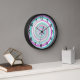 Small round clock with black numerals features an abstract spiral design in white, purple, and teal.