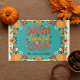 Set a beautiful Thanksgiving table with this customizable paper placemat. The vibrant teal background showcases a lively border of pumpkins, autumn leaves, and flowers. "Grateful, Thankful, Blessed" is elegantly lettered at the center, ready to be personalized with your family name.
