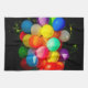 A cluster, bunch of bright and colorful toy balloons against the background of dark forest. Textured photography.