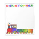 Fun, bright, multicolored choo choo train features red, blue, yellow, green, purple and orange gradients with smoke circles and striped wheels on white background. Personalize with name. Use one letter per template and delete any extras. To center text after name is entered: Click CUSTOMIZE IT, HOLD CTRL down while clicking each letter of name (to highlight them), Click ARRANGE, Click CENTER HORIZONTALLY.