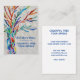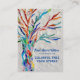 This decorative business card features a print of a rainbow colored tree of life on a pale gray background.