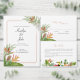 A tropical themed wedding details card with greenery and florals