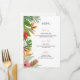 A tropical themed wedding menu with colorful flowers and foliage