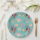 Colorful watercolor illustrations of seashells and underwater plant life create a pattern on aqua background