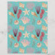 Colorful watercolor illustrations of seashells, coral and underwater plant life create a pattern on aqua background. One side is larger pattern